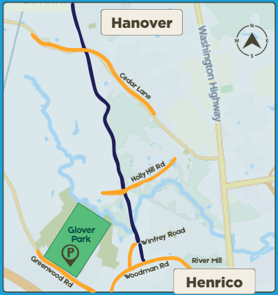 If you are starting your trail experience in Henrico, you can park at Glover Park and walk on the sidewalk or bike on Woodman Road to meet the trail between the intersections on Winfrey Road and Farmstead Mill Drive. If you are using the trail on the weekend, the Greenwood Elementary School parking lot may be available.