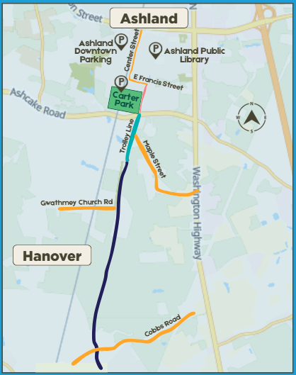 The trail starts in Ashland at the intersection of Ashcake Road and Maple Street, adjacent to Carter Park. It then runs south on the Ashland Trolly line and continues underneath the power lines to Henrico County, where it crosses the Chickahominy River, to reach Woodman Road. You can view an interactive map of the trail here.